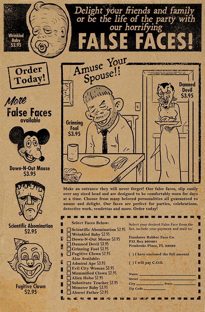 As with my Strangewise No.9 pulp book, this comic will feature ads, a letter column and more. Wanted to share one of the complete ads, this one for the Fanshawe Rubber Face Co.